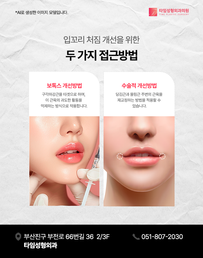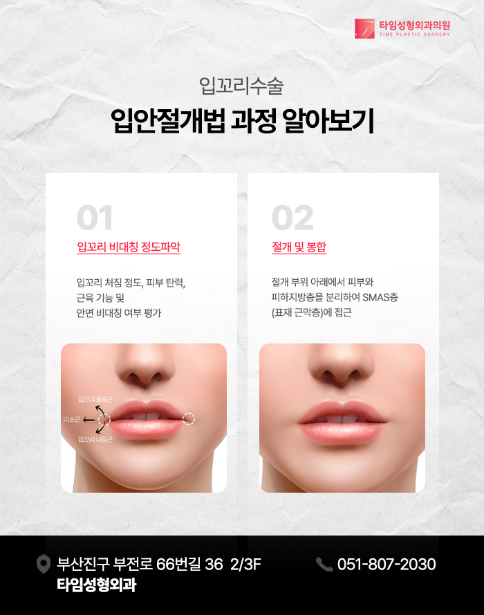 입 주변 근육의 작용과 위치 관계를 고려하여 교정하는 부산입꼬리성형 방법은 방향과 표정 움직임을 함께 고려하는 방식으로 이루어질 수 있습니다. 수술적 방법은 단순히 피부를 당기는 방식이 아니라 입꼬리를 움직이는 근육의 구조와 작용방향을 이해하고 이를 바탕으로 입술균형을 교정하는데 목적이 있습니다.