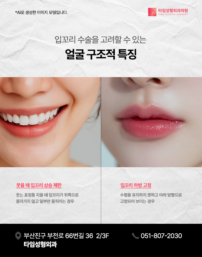 또한 탄력, 지방조직의 위치, 피부와 연부조직의 지지력 등 다양한 요소가 함께 영향을 미치기 때문에 입꼬리의 방향과 움직임은 개인마다 다르게 나타날 수 있습니다.