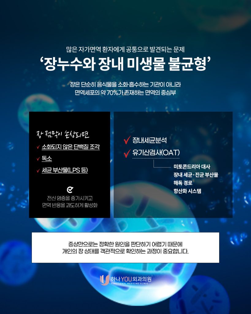 기능의학적으로 보면 부산자가면역질환을 가진 분들 중 장누수 또는 장내 미생물 불균형을 동반하는 경우가 매우 많습니다. 장은 단순히 음식물을 소화·흡수하는 기관이 아니라 면역세포의 약 70%가 존재하는 면역의 중심부이기 때문입니다.