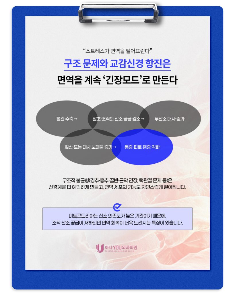 이 흐름이 반복되며 면역 세포의 기능도 자연스럽게 떨어집니다. 특히 부산자가면역질환 미토콘드리아는 산소 의존도가 높은 기관이기 때문에 조직 산소 공급 저하는 면역 회복을 더욱 느리게 합니다.