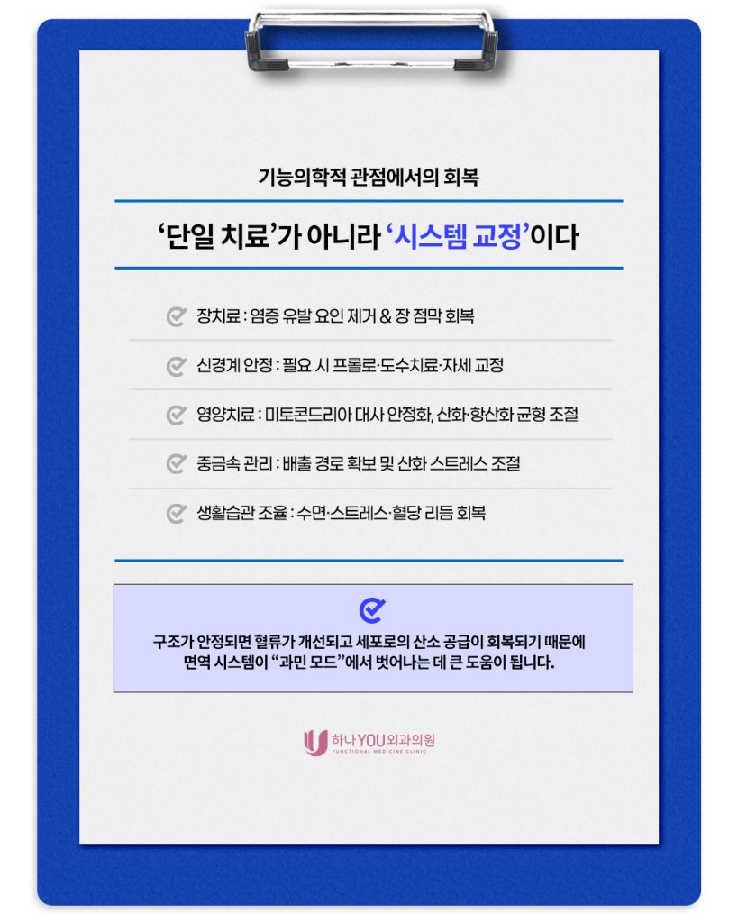 자가면역과 유사한 증상을 다룰 때 단순 염증 억제만으로는 회복이 어렵습니다.
