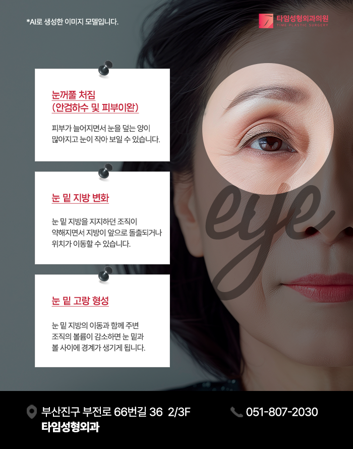 이러한 특성 때문에 상안검 피부가 늘어지면 눈꺼풀 위쪽에 피가 겹쳐지면서 눈매가 무거워 보이거나 눈이 작아 보이는 인상이 형성될 수 있습니다.