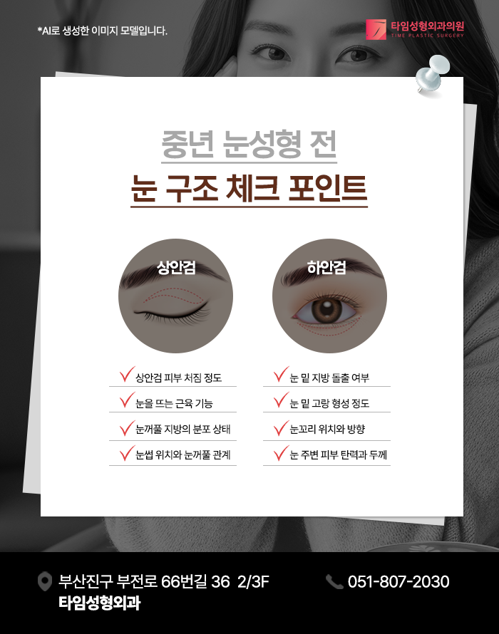 상안검 내부 지방이 돌출되어 있는지, 또는 볼륨이 부족한 부위가 있는지 확인합니다.