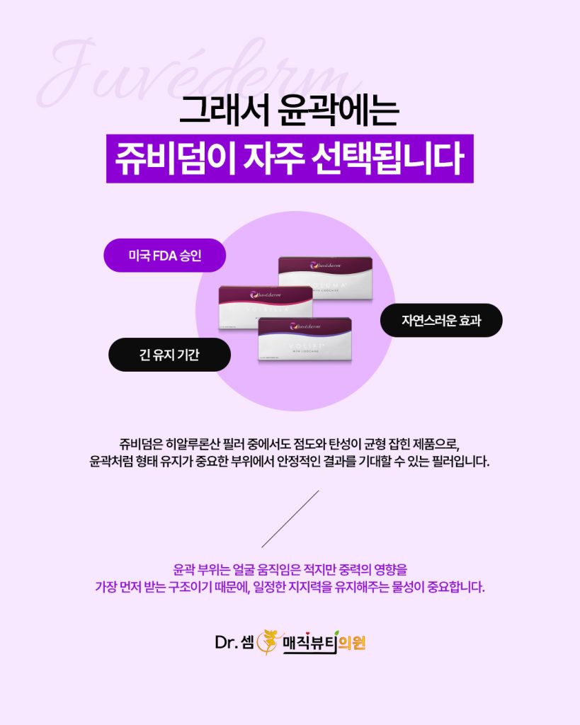 쥬비덤은 히알루론산 필러 중에서도 점도와 탄성이 균형 잡힌 제품으로, 윤곽처럼 형태 유지가 중요한 부위에서 안정적인 결과를 기대할 수 있는 필러입니다.