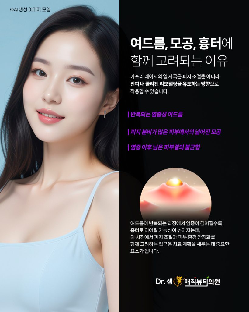 여드름이 반복되는 과정에서 염증이 깊어질수록 흉터로 이어질 가능성이 높아지는데 이 시점에서 피지 조절과 피부 환경 안정화를 함께 고려하는 접근은 치료 계획을 세우는 데 중요한 요소가 됩니다. 카프리 레이저는 이러한 흐름 속에서 여드름, 모공, 흉터 관리에 복합적으로 활용될 수 있는 장비로 분류됩니다.