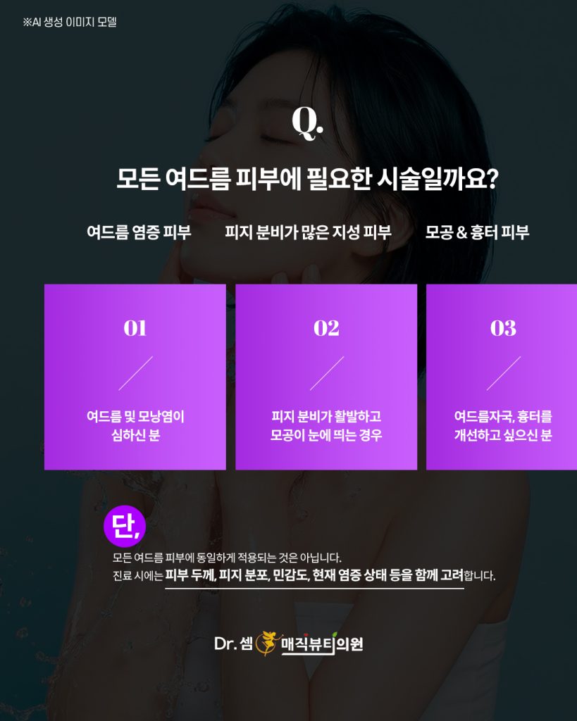 일반적으로는 특정 부위에 여드름이 반복되는 경우, 피지 분비가 매우 활발한 경우, 약물 치료만으로는 한계를 느끼는 경우, 흉터로 진행되기 전 단계에서 적극적인 관리가 필요한 경우 등에 하나의 선택지로 고려될 수 있습니다.