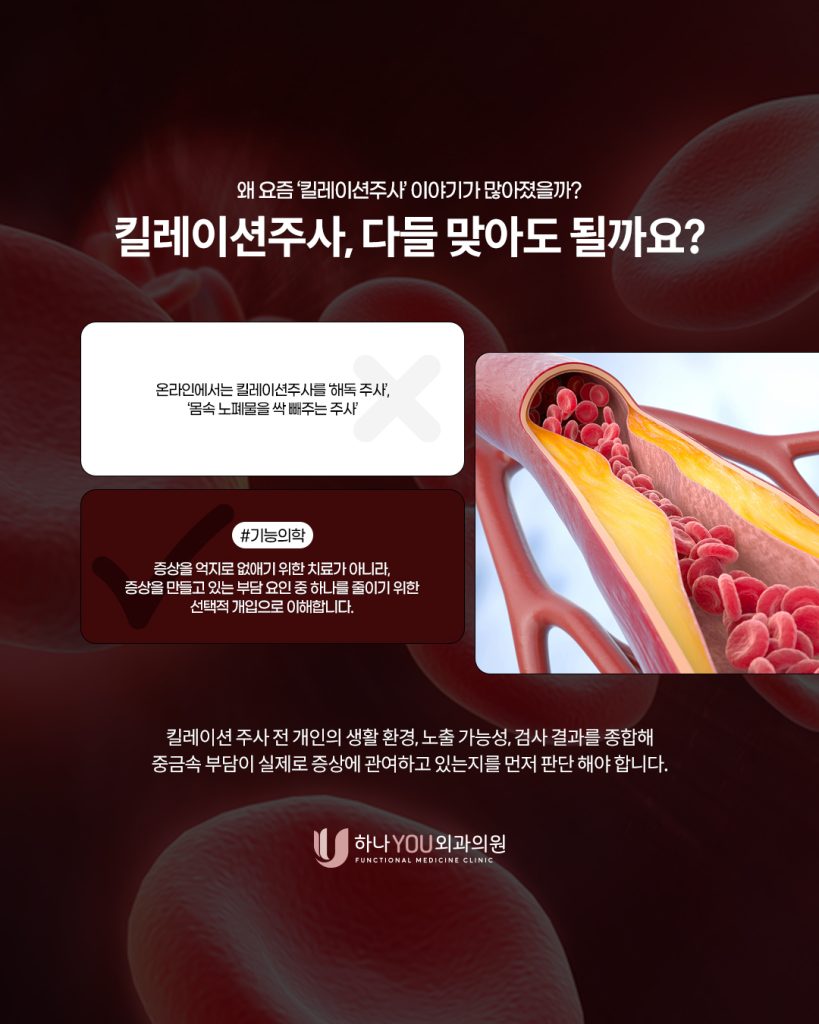 킬레이션은 유행처럼 선택하는 치료가 아니라, 조건이 맞을 때 고려하는 치료 옵션 중 하나라는 점을 분명히 할 필요가 있습니다.