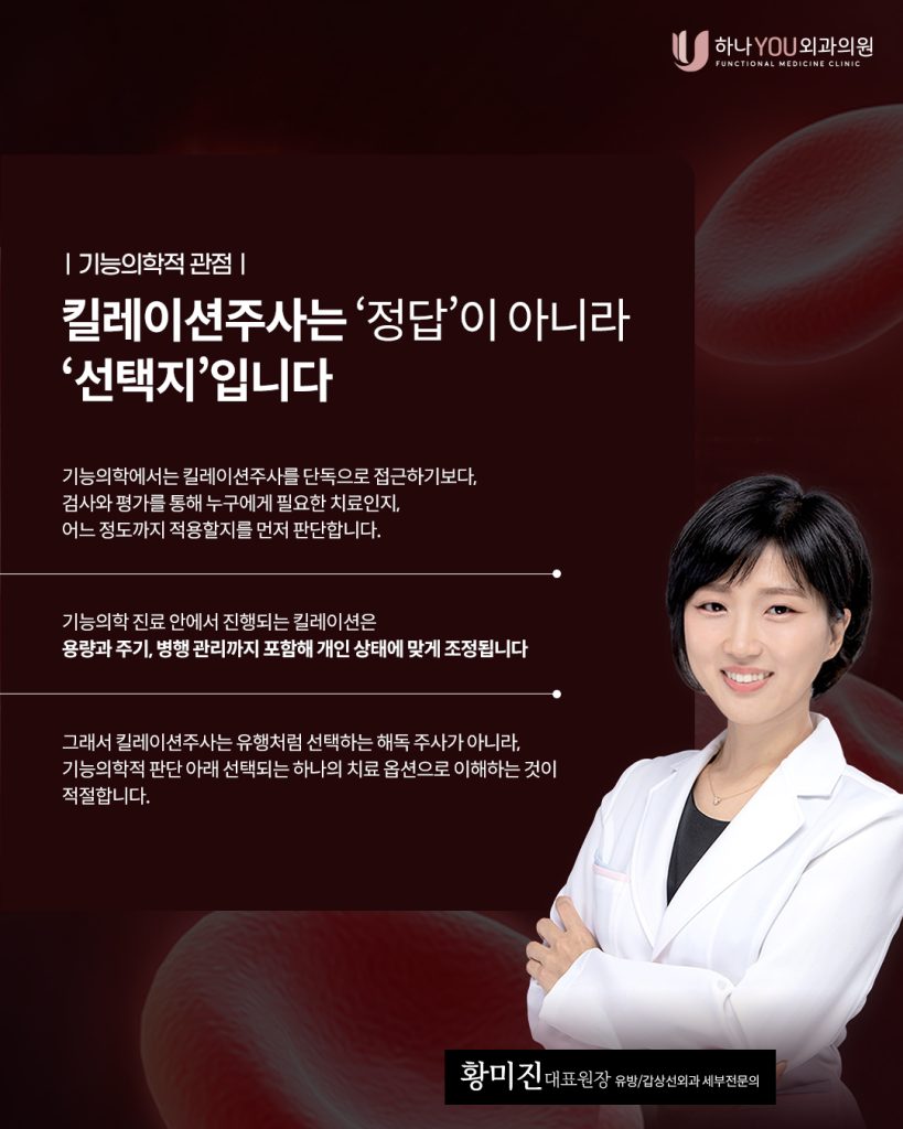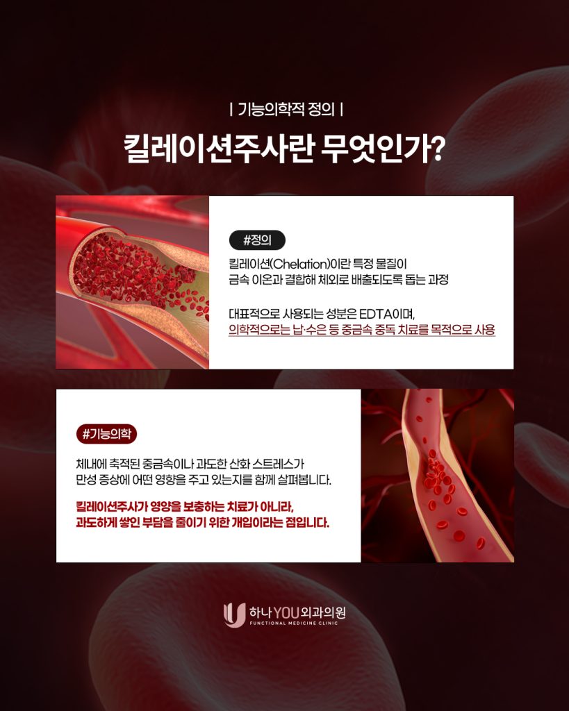 그래서 킬레이션주사는 유행처럼 선택하는 해독 주사가 아니라, 기능의학적 판단 아래 선택되는 하나의 치료 옵션으로 이해하는 것이 적절합니다.
