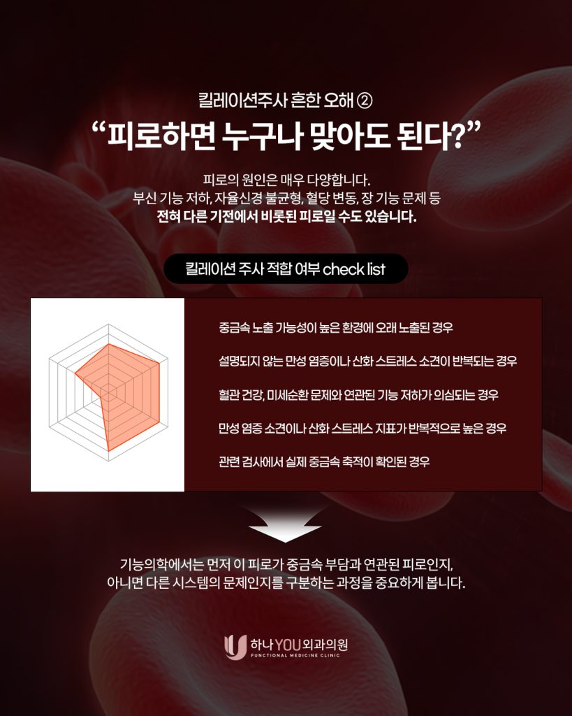 피로하다고 해서 모두가 킬레이션 대상이 되는 것은 아닙니다. 피로의 원인은 매우 다양하며 부신 기능 저하, 자율신경 불균형, 혈당 변동, 장 기능 문제 등 전혀 다른 기전에서 비롯된 피로일 수도 있습니다.