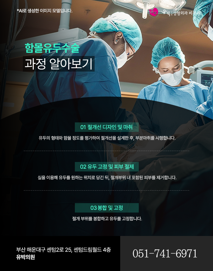 함몰유두수술 전 유방 형태, 유두와 유륜의 비례, 그리고 후퇴 정도를 면밀히 관찰한 뒤 돌출 방향과 높이를 고려하여 절개 부위를 지정해야 합니다. 또한 함몰된 부위는 섬유성 밴드나 단축된 유관이 당겨져 안쪽으로 잡아당겨진 상태인 경우가 많습니다. 때문에 돌출 높이를 유지할 수 있도록 실을 이용해 고정한 뒤 절제 및 봉합이 시행됩니다.