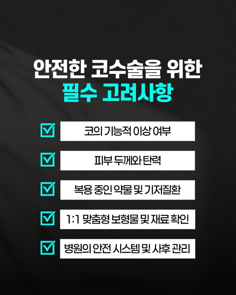 코수술은 얼굴 중심부에 이루어지는 만큼 안정성에 대한 고려가 중요합니다.