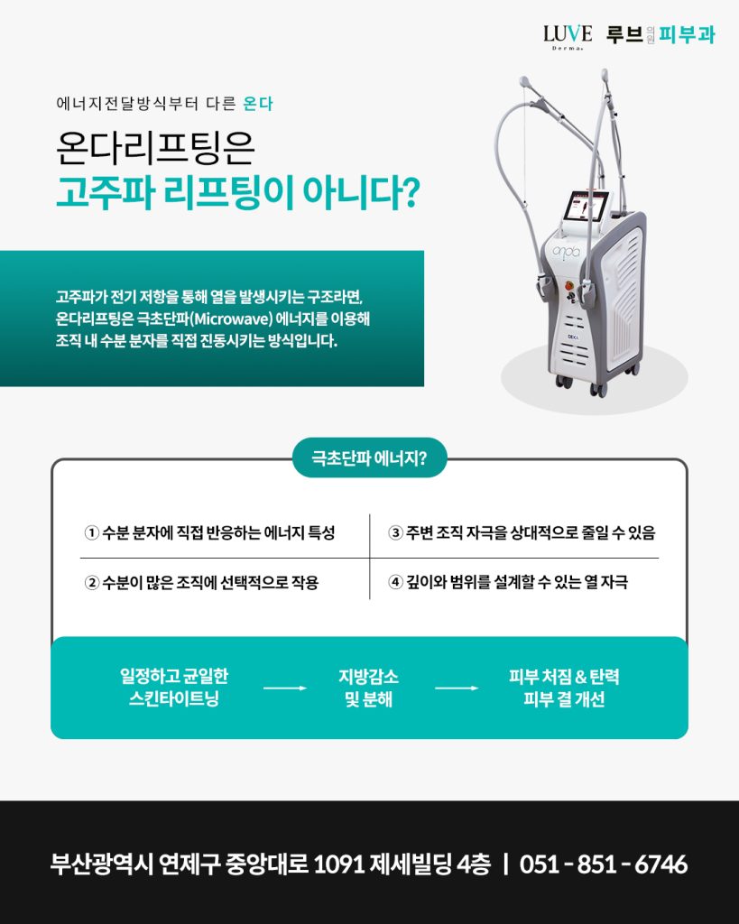 연산동온다리프팅을 이해하려면 먼저 이 시술이 단순히 고주파 리프팅이 아니라는 점을 짚고 넘어가야 합니다. 온다 리프팅은 극초단파 에너지를 사용하는 방식으로 전기 저항을 통해 열을 만드는 일반 고주파 리프팅과는 에너지가 작용하는 메커니즘 자체가 다릅니다.
