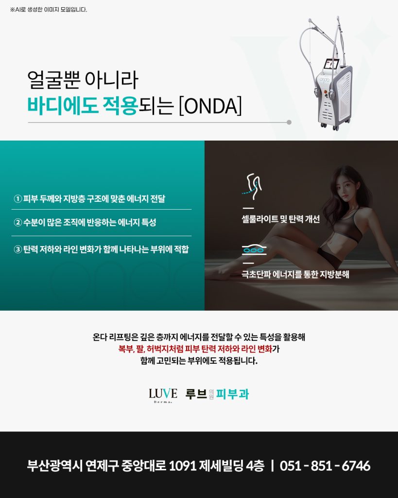 연산동온다리프팅은 깊은 층까지 에너지를 전달할 수 있는 특성을 활용해 복부, 팔, 허벅지처럼 피부 탄력 저하와 라인 변화가 함께 고민되는 부위에도 적용됩니다.