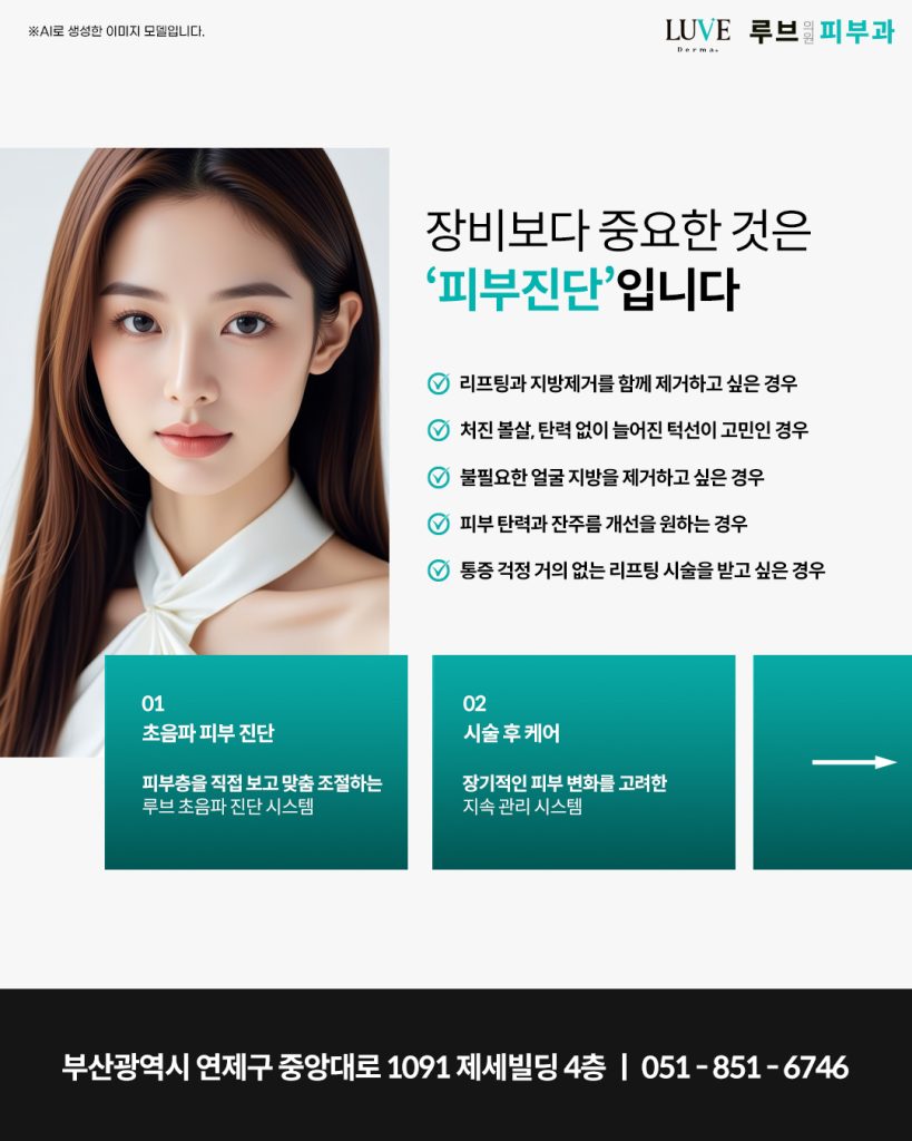때문에 부산 연산동 루브의원에서는 초음파 피부 진단 장비를 사용하여 시술 전 피부층을 직접 확인하고 필요한 깊이와 강도를 고려해 온다리프팅을 설계합니다.