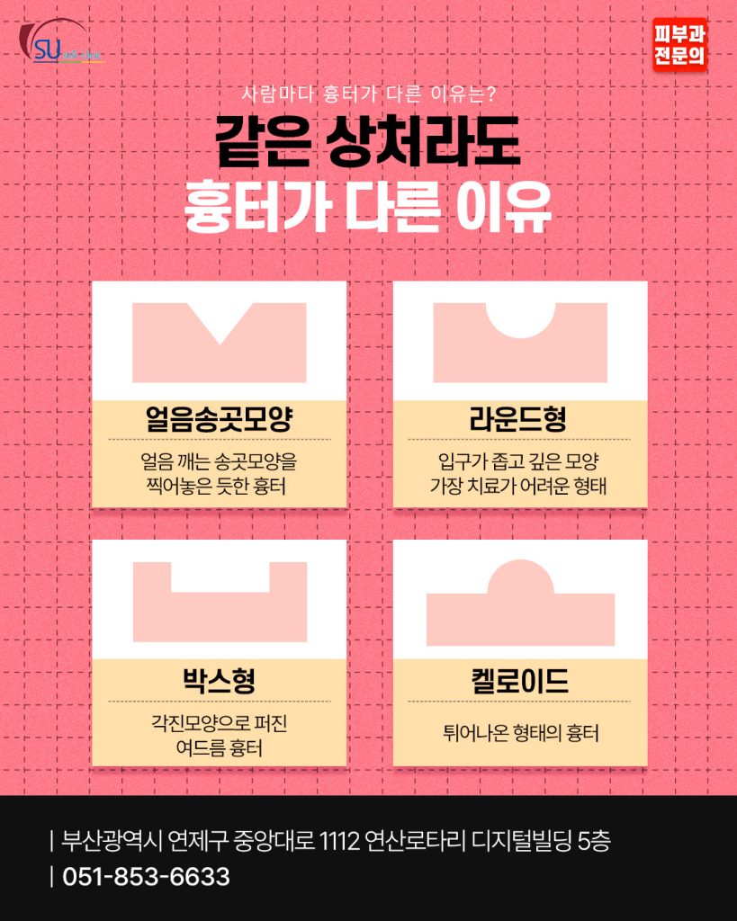흉터는 크게 팬 형태, 튀어나온 형태, 색 변화 위주로 나뉘며, 각각 접근 방식이 다르게 논의됩니다.