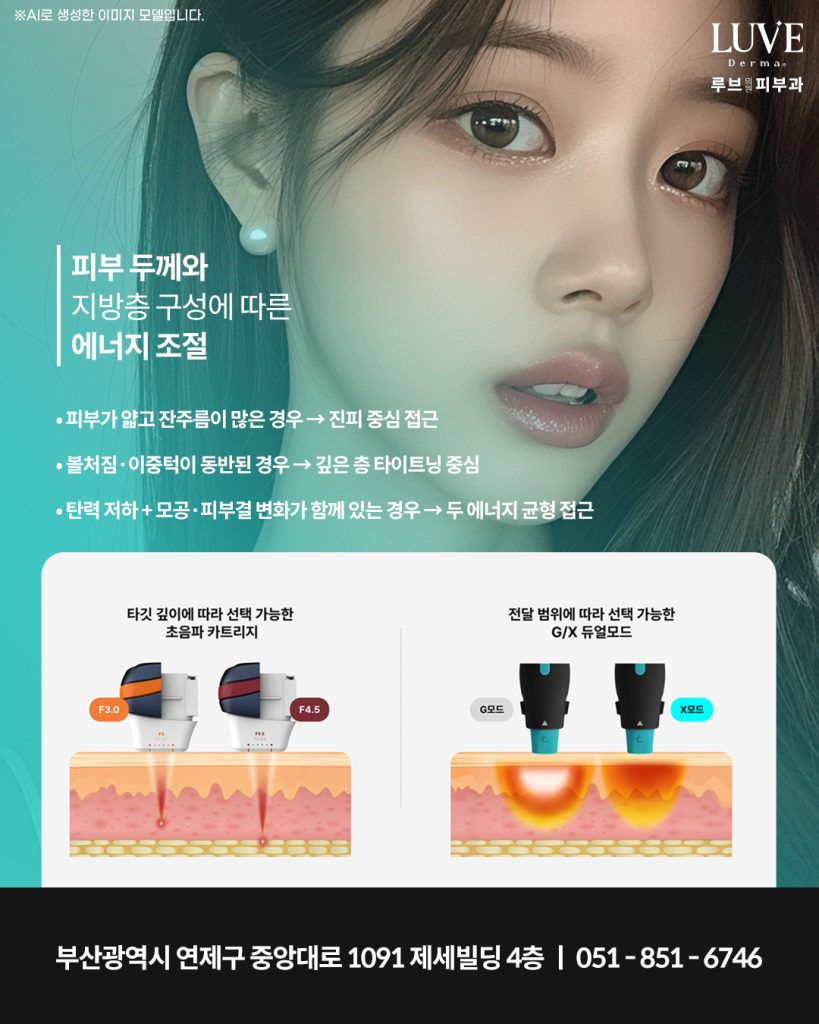 과도한 자극을 주기보다 필요한 층에 필요한 방식으로 에너지를 전달하는 설계를 기반으로 하며, 피부 두께·지방층 위치·탄력 정도·모공·잔주름 등 여러 요소를 분석해 초음파와 고주파의 비중을 조절하는 방식이 중요합니다.
