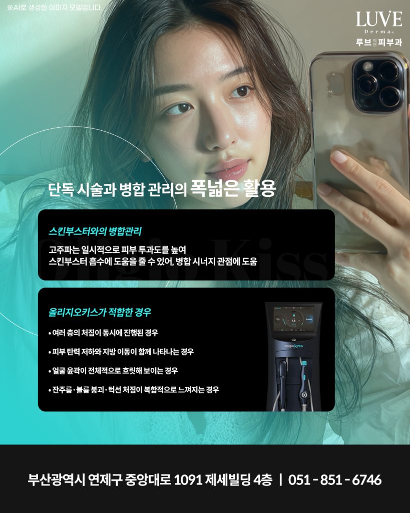 올리지오키스는 단독 사용도 가능하지만, 스킨부스터와 병합하여 관리하는 방식도 널리 활용되고 있습니다. 고주파는 일시적으로 피부 투과도를 높여 스킨부스터 흡수에 도움을 줄 수 있어 병합 시너지 측면에서도 선택됩니다. 다만 이러한 병합 방식은 개인의 피부 상태와 반응성 등을 종합적으로 고려해야 하기 때문에 시술 전 충분한 부산 연산동 피부과 상담이 필요합니다.