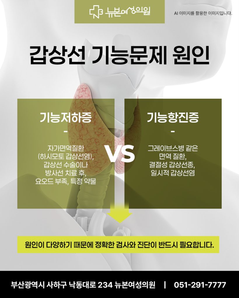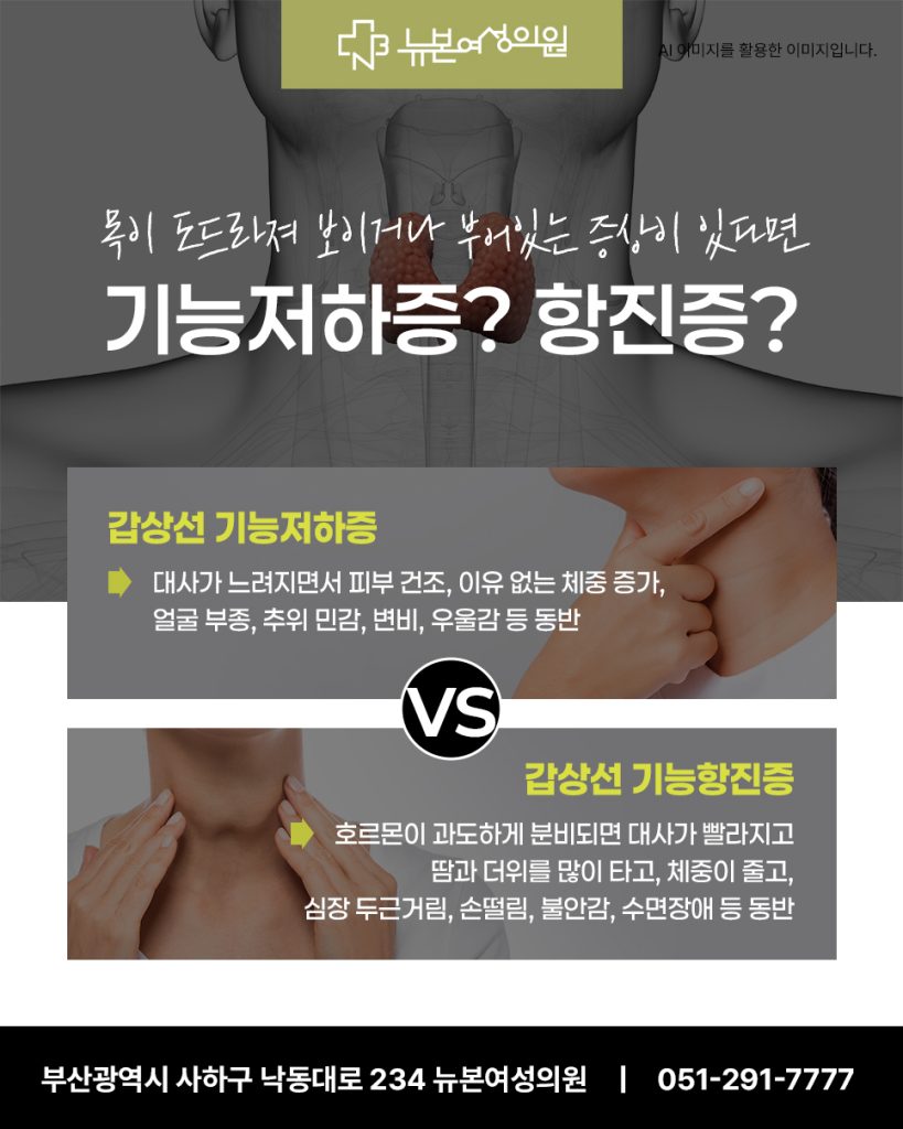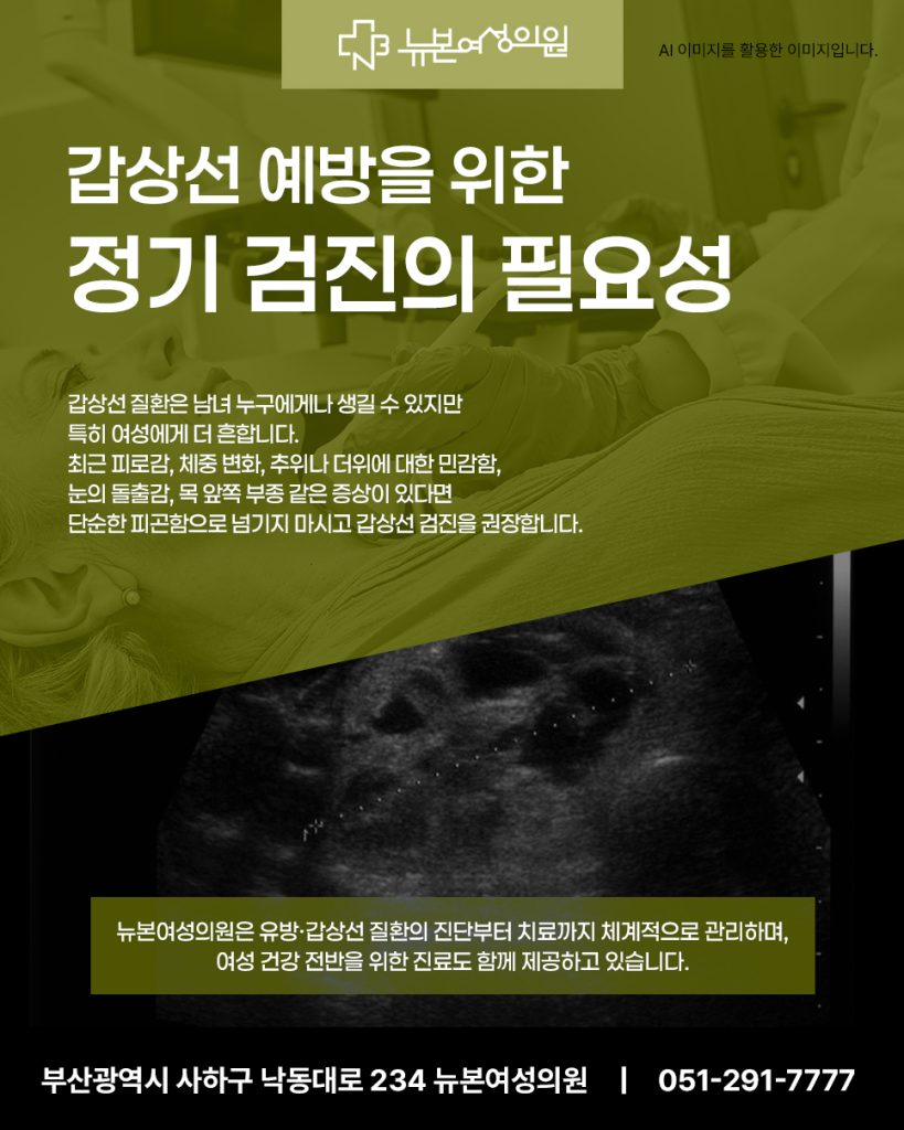 갑상선 질환은 남녀 누구에게나 생길 수 있지만 특히 여성에게 더 흔합니다. 최근 피로감, 체중 변화, 추위나 더위에 대한 민감함, 눈의 돌출감, 목 앞쪽 부종 같은 증상이 있다면 단순한 피곤함으로 넘기지 마시고 사하구갑상선 검진을 권장합니다. 뉴본여성의원에서는 혈액검사와 초음파 검사를 통해 갑상선의 기능적·구조적 이상을 면밀히 확인합니다. 또한 유방·갑상선 질환의 진단부터 치료까지 체계적으로 관리하며, 여성 건강 전반을 위한 진료도 함께 제공하고 있습니다.