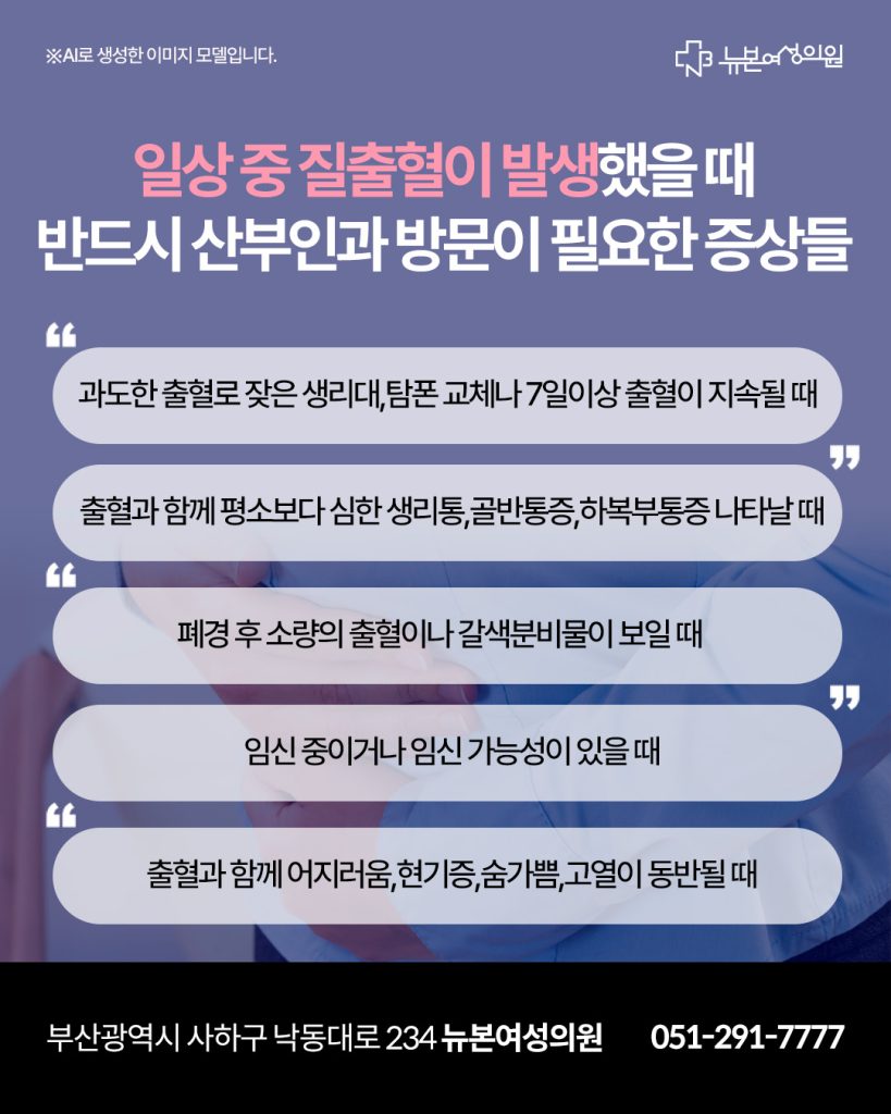 이처럼 사하구질출혈 증상이 이러한 상황과 함게 나타난다면 산부인과 전문의 상담을 통해 상태를 확인해보는 것이 안전합니다.