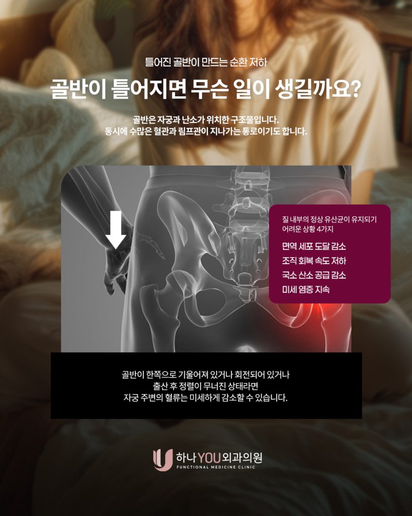 골반이 한쪽으로 기울어져 있거나 출산 후 정렬이 무너진 상태라면 자궁 주변의 순환이 미세하게 떨어질 수 있습니다.