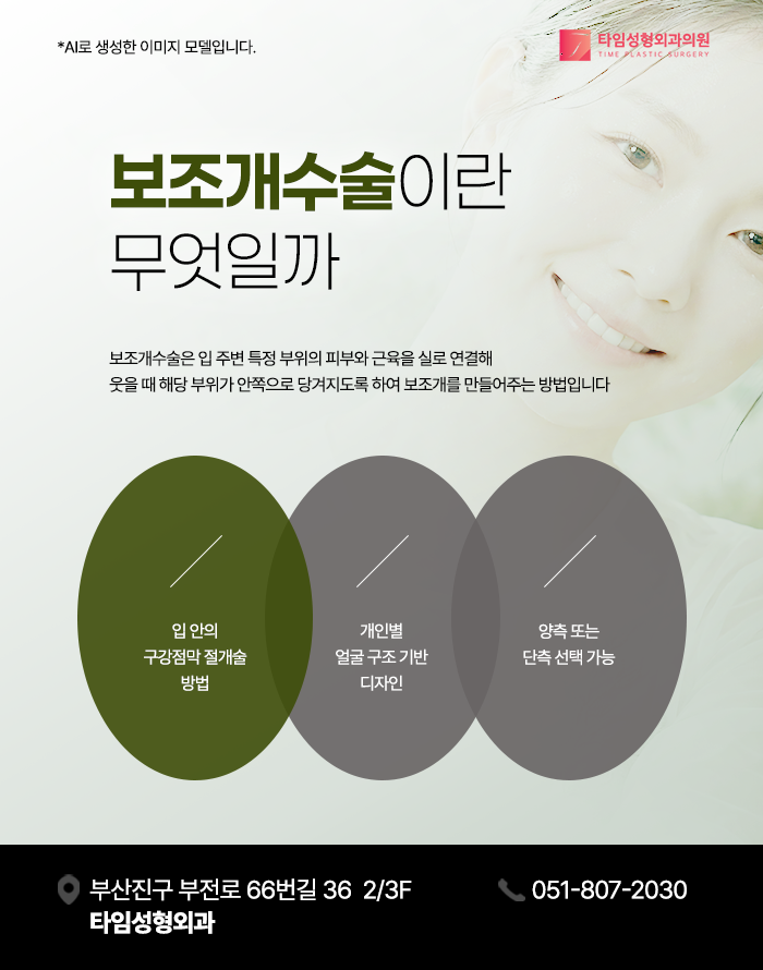 서면보조개수술은 얼굴의 특정 부위에 유착구조를 형성하여 표정 변화 시 피부가 안쪽으로 함몰되도록 유도함으로써 보조개를 형성하는 방법을 말합니다. 일반적으로 보조개는 선천적으로 존재하는 경우 특정 표정이나 미소를 지을 때 피부와 근육 간의 부착관계에 의해 발생합니다.
