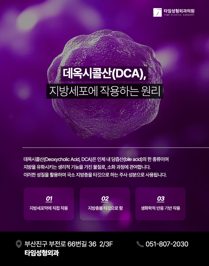 DCA는 지방세포막의 구조에 작용하여 세포막을 불안정하게 만드는 특성을 가지고 있으며 이 과정에서 지방세포의 파괴가 유도됩니다. 파괴된 지방세는 체내 대사과정을 통해 점진적으로 처리됩니다.