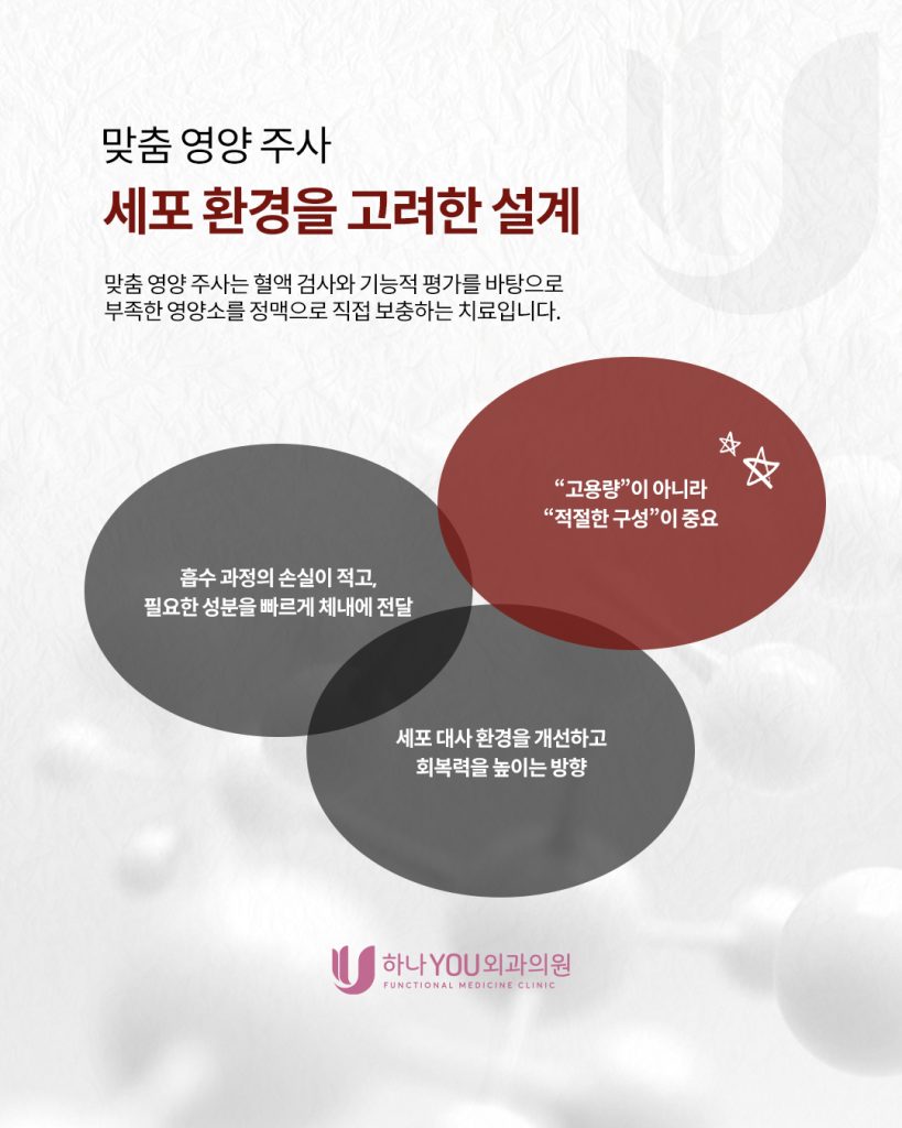 맞춤 영양 주사는 이러한 세포 환경을 개선해 신체 회복력을 보조하는 역할을 합니다. 단순히 기운을 끌어올리는 것이 아니라 몸이 스스로 회복할 수 있는 조건을 만드는 과정이라고 이해하시면 좋습니다.