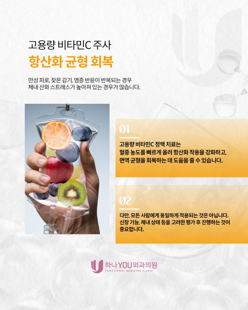 따라서 적절한 평가 후 진행되는 고용량 비타민C 치료는 일시적 각성이 아니라, 산화 스트레스 환경을 조절하는 데 의미를 둡니다.