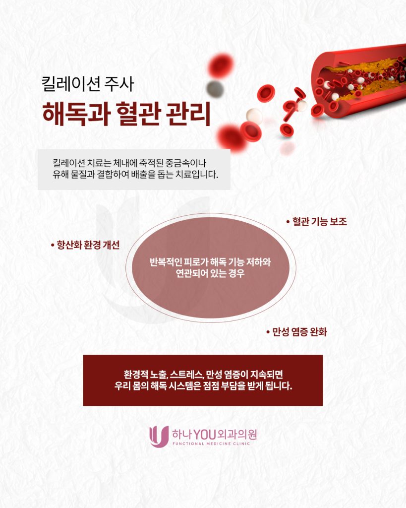 해독 기능이 원활하지 않으면 만성 피로, 두통, 집중력 저하 등의 증상이 동반될 수 있습니다. 킬레이션은 이러한 해독 과정을 보조하여 체내 환경을 정리하는 데 도움을 줄 수 있으며, 혈관 기능 개선과 항산화 환경 조절 측면에서도 의미가 있습니다.