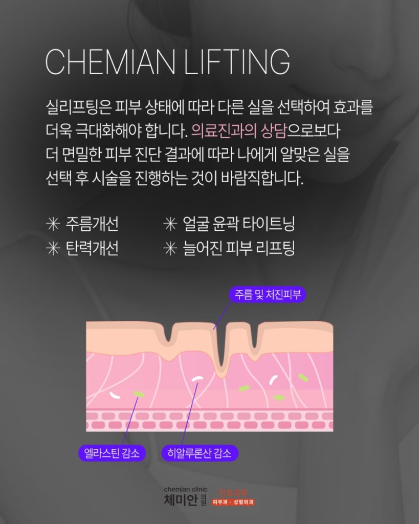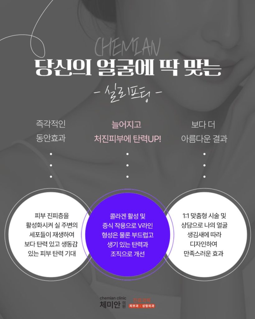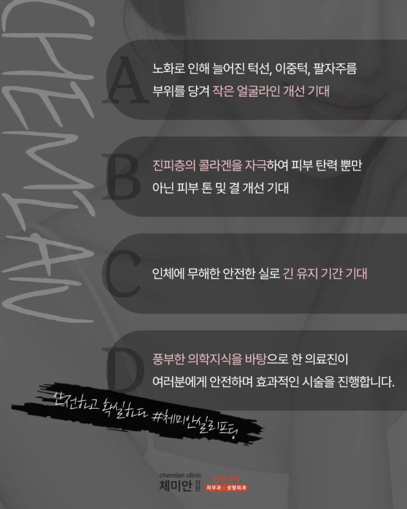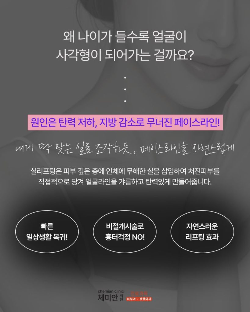 서면실리프팅은 단순히 주름만 해결하는 것이 아니라, 얼굴 전반의 윤곽과 피부 건강을 함께 개선할 수 있는 방법입니다.서면체미안의원은 실리프팅에 관한 올바른 의학정보를 전달드리고자 하며, 실제 시술 여부와 방법은 개인의 피부 상태에 따라 달라질 수 있음을 안내드립니다.