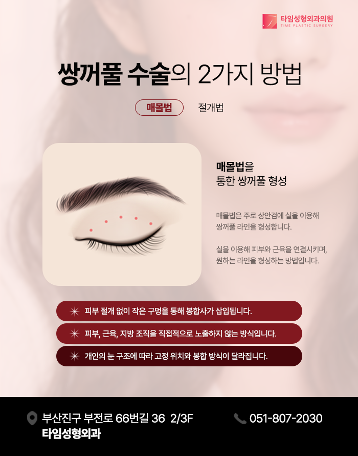 매몰법은 상안검 피부를 절개하지 않고 봉합사를 이용하여 피부와 안검거근 또는 건막 사이에 연결구조를 형성함으로써 쌍꺼풀 주름이 만들어지도록 하는 수술적 방법입니다. 이는 눈을 뜨는 동작에 따라 피부가 접히는 해부학적 원리를 활용하여 주름 구조를 형성하는 쌍꺼풀 형성법으로 분류됩니다.