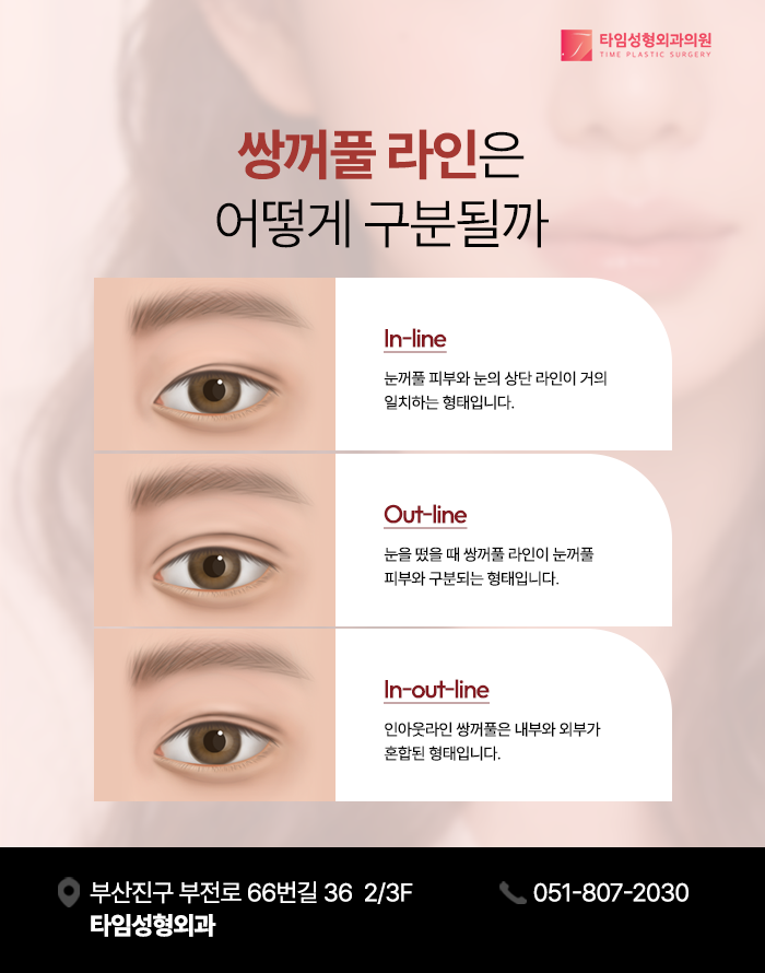 인라인은 상안검 피부의 접힙선이 눈의 상단 윤곽선과 거의 일치하는 형태를 의미합니다. 눈을 떴을 때 라인이 눈매의 윤곽과 평행하게 이어지며 눈꺼풀 피부와 쌍꺼풀 라인의 경계가 비교적 뚜렷하지 않은 것이 특징입니다.