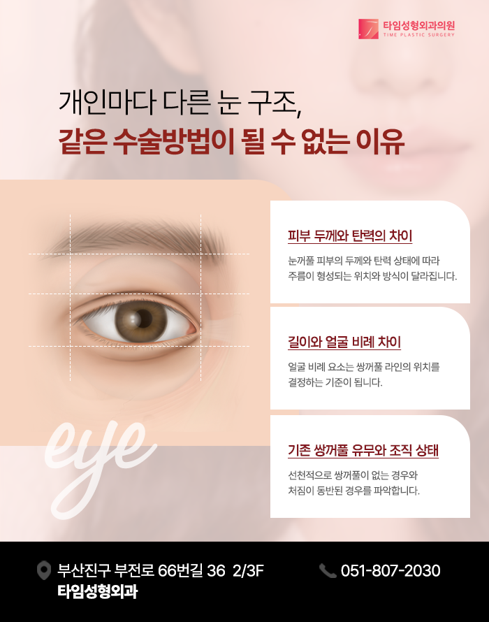 이러한 구조적 특성은 개인마다 선천적, 후천적 요인에 따라 차이를 보이므로 쌍꺼풀수술에서는 획일적인 방법을 적용하기에는 어려움이 있습니다.