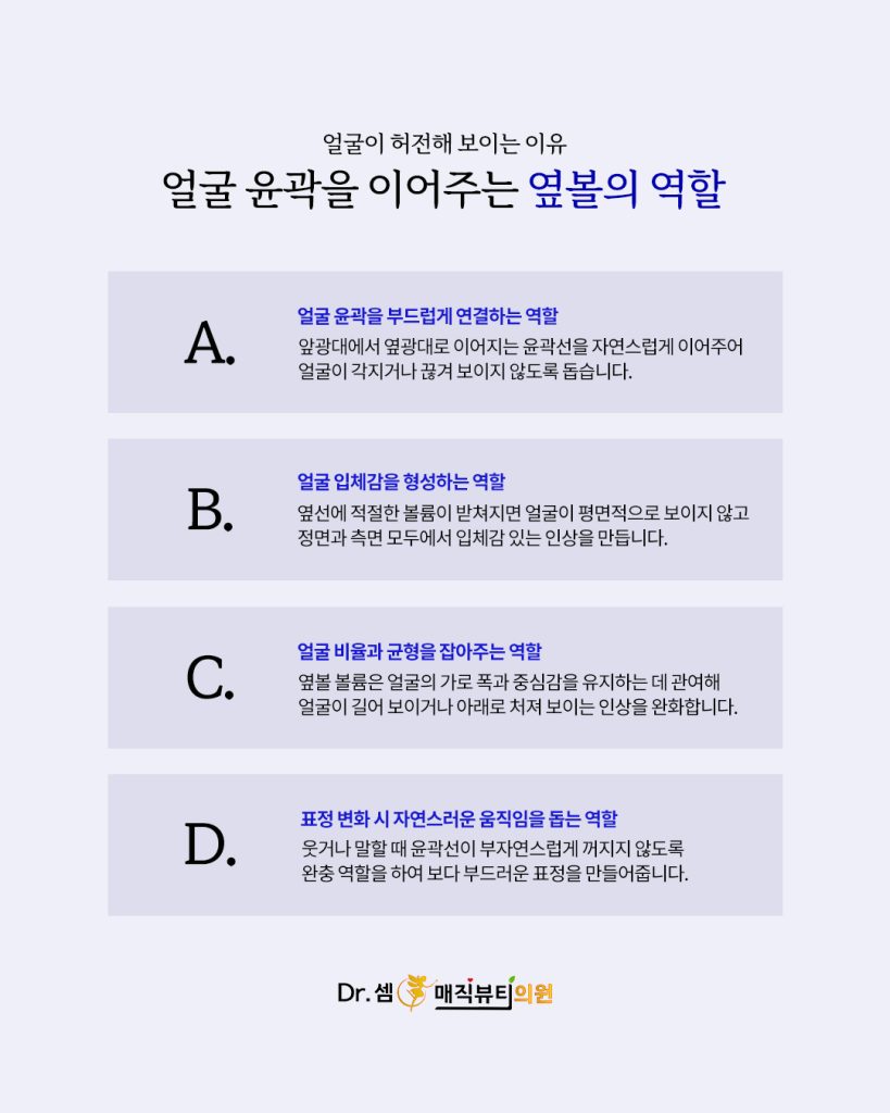 옆볼은 생각보다 섬세한 부위입니다. 단순히 살이 붙어 있는 공간이 아니라, 얼굴 윤곽을 부드럽게 이어주는 완충 역할을 하는 영역이기 때문입니다. 이 부위가 꺼지면 얼굴 중심이 아래로 쏠려 보이거나 중안부가 길어 보이는 느낌을 받을 수도 있습니다.