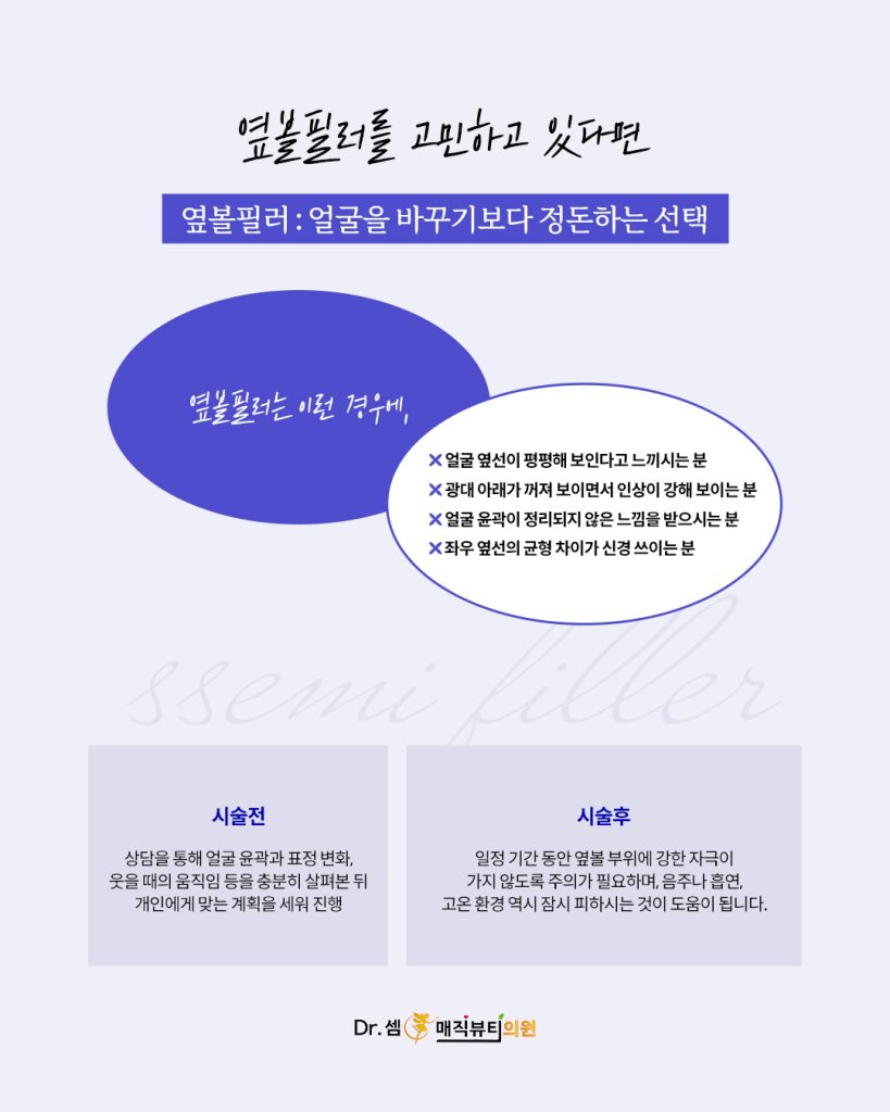 옆볼필러는 얼굴을 완전히 바꾸기 위한 선택이 아니라, 나이와 함께 변화한 얼굴 구조를 정돈해주는 과정에 가깝습니다. 충분한 상담을 통해 본인에게 필요한 접근인지 차분히 살펴보신다면, 보다 만족스러운 결과에 도움이 될 수 있습니다.