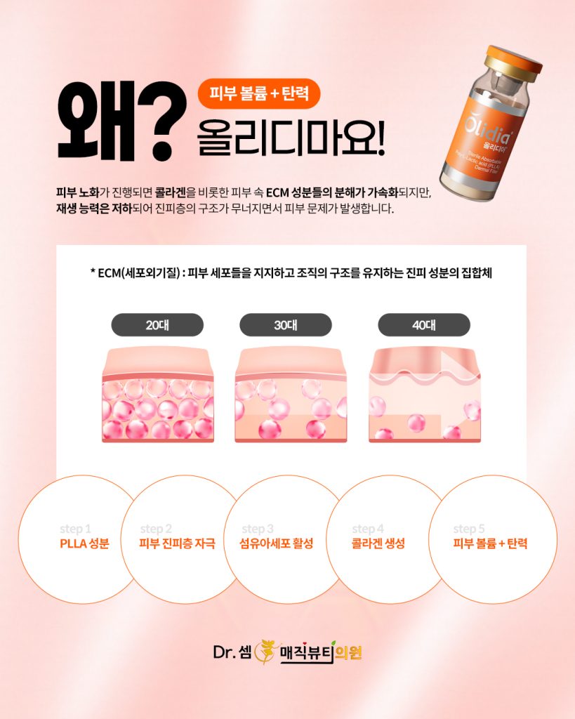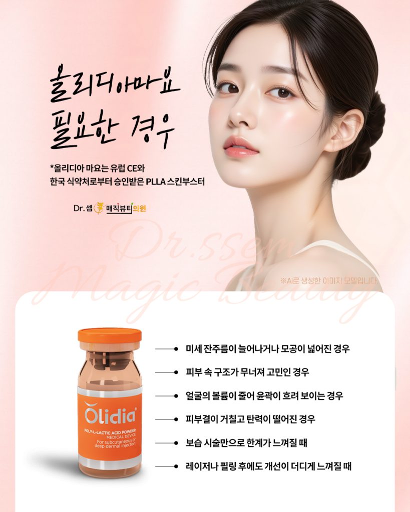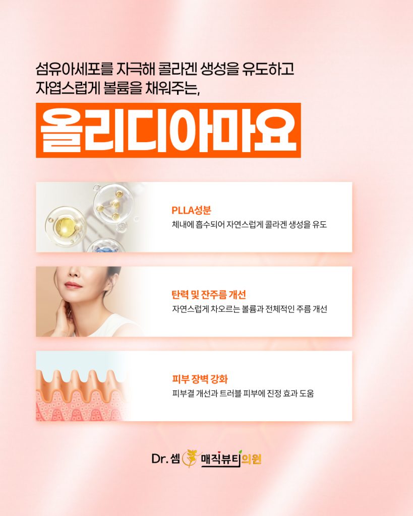 필러가 즉각적인 볼륨 채움에 초점을 맞췄다면, 올리디아마요는 진피의 콜라겐 구조 자체를 복원하는 재생 중심 시술입니다.