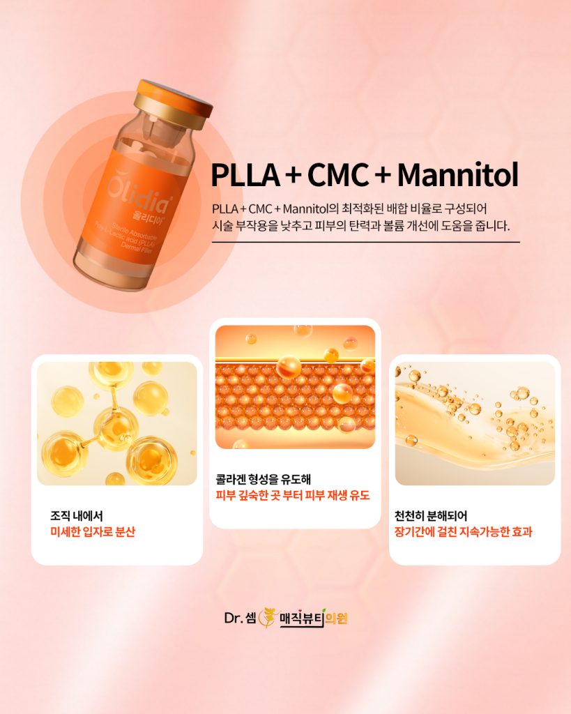 서면올리디아마요는 이 PLLA 입자를 일정한 농도로 미세하게 분산시켜 진피층 혹은 피하층에 주입함으로써 시간이 지날수록 피부 속 구조를 재정비하게 됩니다.