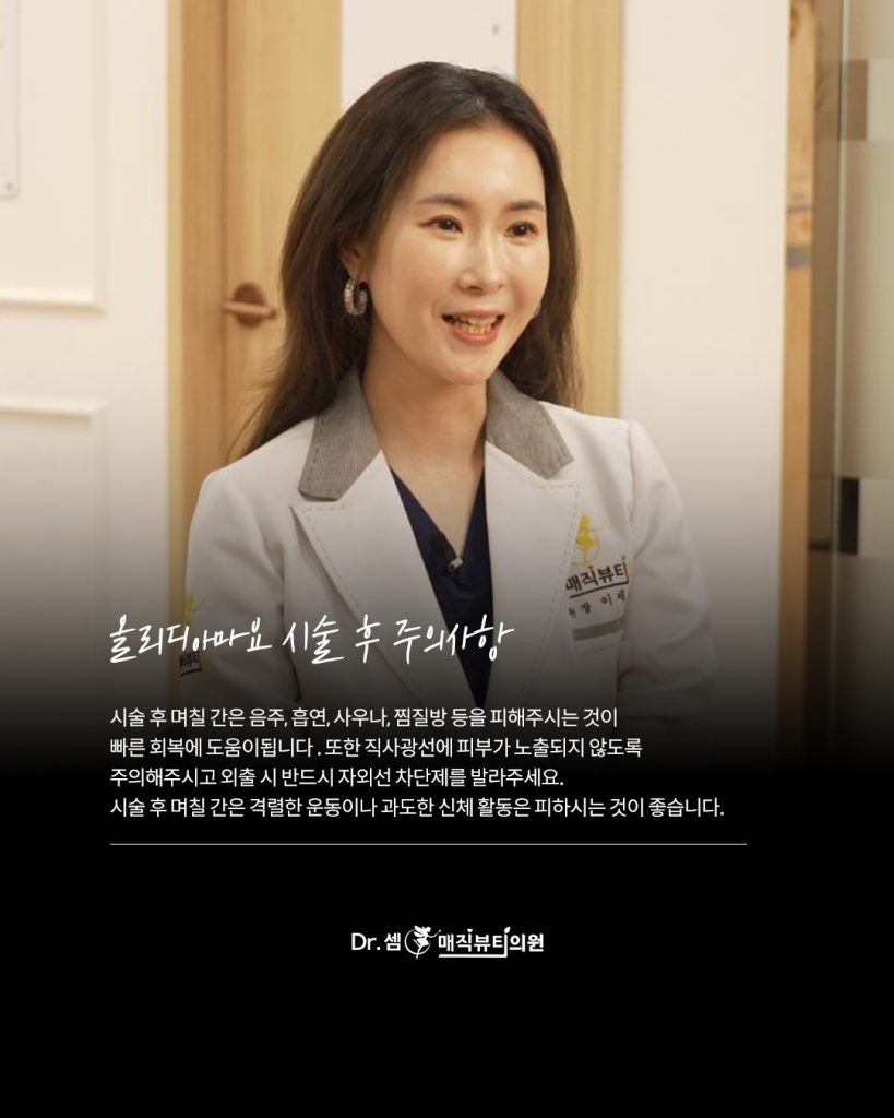 시술은 평균 20~30분 정도로 비교적 짧게 진행되며, 서면올리디아마요 시술 후 가벼운 홍조나 붓기가 있을 수 있지만 대부분 하루 이틀 내로 가라앉습니다.