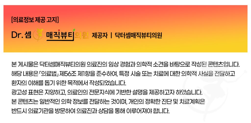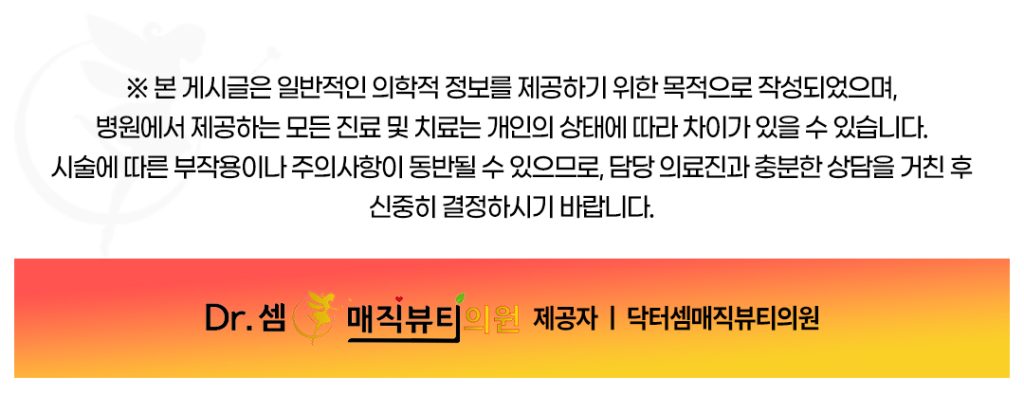 또한 시술 후 1주일 정도는 과도한 음주, 흡연, 사우나, 고온의 찜질 등을 피하는 것이 좋습니다. 자외선 차단제 사용과 꾸준한 보습 관리는 재생 과정의 안정성과 유지기간을 높이는 데 도움이 됩니다.