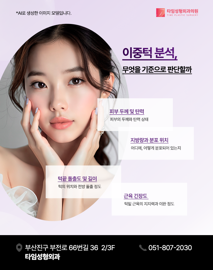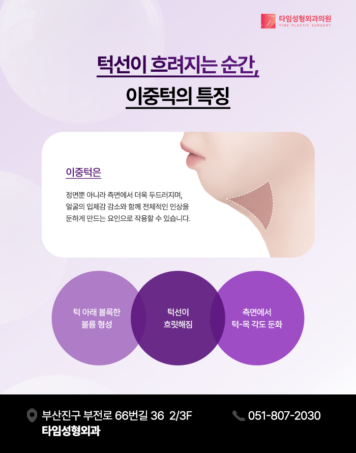 이중턱은 정면에서만 드러나는 것이 아니라, 측면에서 더욱 명확하게 인식되는 경우가 많으며 얼굴의 입체감을 감소시키는 요인으로 작용할 수 있습니다.