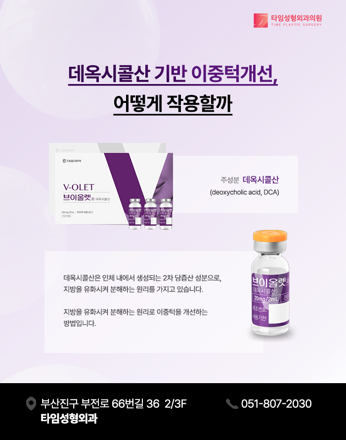 브이올렛주사는 데옥시콜산을 주요 성분으로 하는 방식으로 지방 세포에 직접 작용하는 특성을 기반으로 합니다.