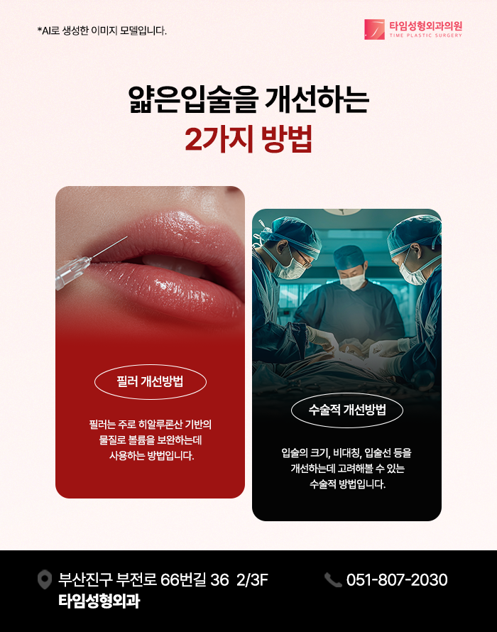 얇은 입술을 개선하기 위한 입술필러 방법이란 히알루론산 기반 물질을 활용하여 연부 조직 내부의 볼륨을 채워 부족한 높이, 곡선, 대칭성을 보완하는 방법을 말합니다. 중앙부 높이가 낮아 전체적인 볼륨이 부족한 형태나 한쪽 입술이 얇은 경우, 좌우 대칭을 개선하는데 적용할 수 있습니다.