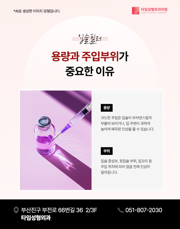 입술만 단독으로 부피가 증가하면, 주변 부위와의 비율이 왜곡되면서 시각적 무게중심이 하단부로 치우치게 됩니다.