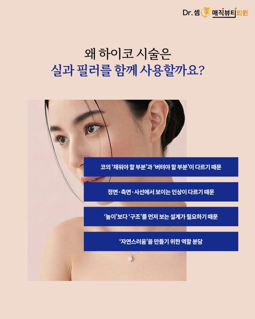 서면코필러(하이코) 시술이 실과 필러를 조합하는 방식으로 알려진 이유도 바로 이 역할 차이 때문입니다.