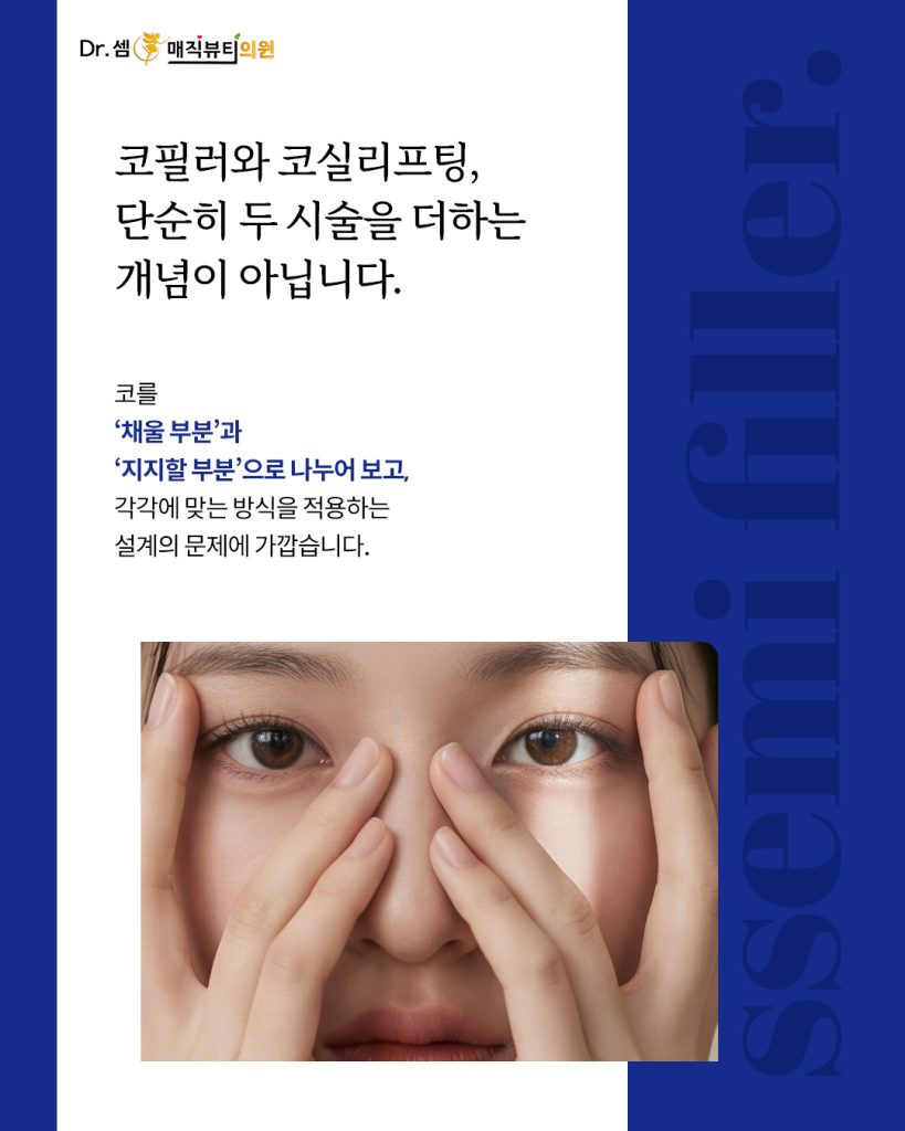 에 따라 설계는 완전히 달라질 수 있습니다. 어떤 경우에는 서면코필러만으로도 충분히 균형 잡힌 인상을 만들 수 있고, 어떤 경우에는 실리프팅 중심의 접근이 더 자연스러울 수도 있습니다.