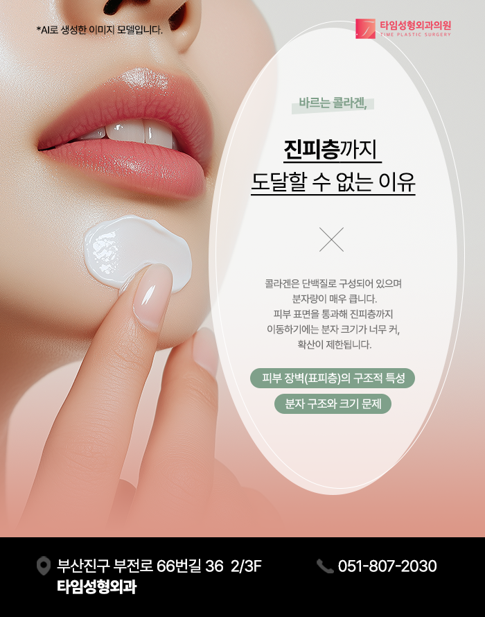 바르는 콜라겐 크림이 진피층까지 도달하기 어려운 주된 이유는 이 각질층의 구조적 특성과 분자적 특성에 있습니다. 콜라겐은 단백질로 구성된 고분자 물질이며, 분자량이 상당히 크기 때문에 표피를 통과하는 것이 쉽지 않습니다. 단순히 표면에 도포하는 방식으로는 외부에서 공급된 단백질이 진피층까지 스며들기 어렵고, 대부분 표피에 머물러 얇은 보호막 역할에 그치게 됩니다