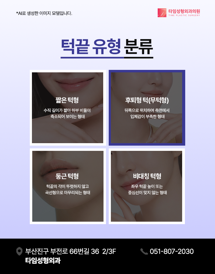 특히 턱끝의 위치와 길이는 정면 뿐 아니라 측면을 형성하는 중요한 기준점이 되며 입체감을 좌우하는 요소로 평가됩니다. 여러 유형 중 무턱형은 하악 전방부가 정상적인 기준 위치보다 후방에 위치한 상태를 의미하며 이는 선천적인 골격구조, 성장과정에서의 발달차이, 또는 근육과 연부조직 분포의 영향 등 다양한 요인에 의해 형성될 수 있습니다.