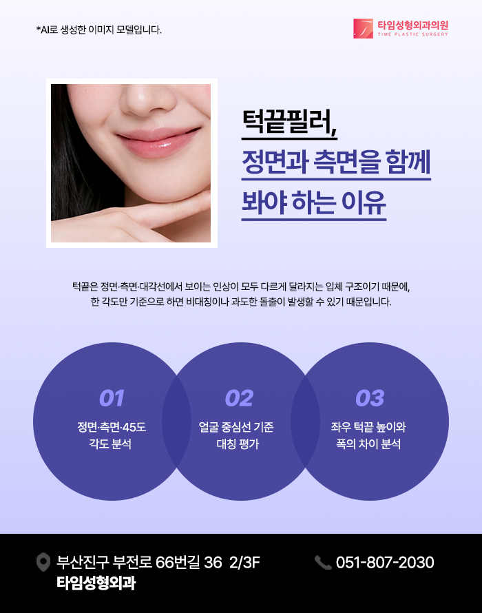 정면에서만 턱끝을 관찰하고 디자인을 결정하게 되면 옆모습에서 과도하게 돌출되거나 반대로 입체감을 형성하지 못하는 문제가 발생할 수 있습니다. 이는 얼굴 중심축의 불균형, 윤곽선의 부자연스러움, 그리고 인위적인 인상으로 이어질 가능성이 있어 서면턱끝필러 전, 다각도 분석을 기반으로 한 입체적 접근이 필요합니다.