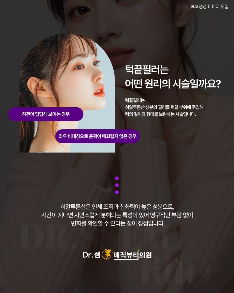 서면턱끝필러는 히알루론산 성분의 필러를 턱 끝 부위에 주입해 턱의 길이와 형태를 보완하는 시술입니다.