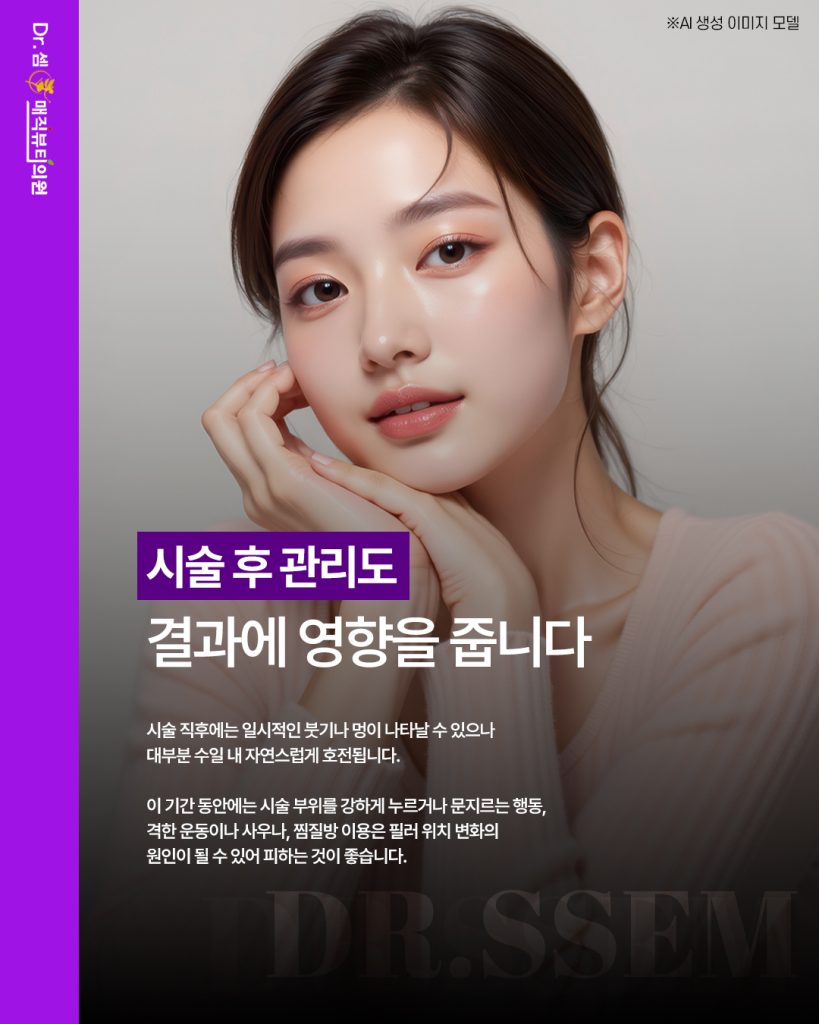 서면턱끝필러 시술 직후에는 일시적인 붓기나 멍이 나타날 수 있으나 대부분 수일 내 자연스럽게 호전됩니다. 이 기간 동안에는 시술 부위를 강하게 누르거나 문지르는 행동, 격한 운동이나 사우나, 찜질방 이용은 필러 위치 변화의 원인이 될 수 있어 피하는 것이 좋습니다.
